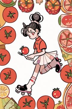 1girl, double bun, hair bun, skates, roller skates, food, solo, skirt, shirt, white background, red shirt, short sleeves, fruit, holding, socks, white skirt, fork, profile, simple background, black hair, tomato, inline skates, print shirt, black eyes