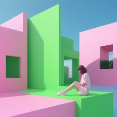 <lora:secai-surenjike:0.4>,a girl sitting on the edge of a green building, in the style of rendered in cinema4d, hallyu, conceptual playlists, bright sculptures, seaside scenes, animated gifs, contemporary candy-coated
