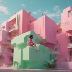 sharp perspective angles,the edge of a Jade building,in the style of rendered in cinema4d,Wes Anderson,conceptual playlists,bright sculptures,seaside scenes,animated gifs,contemporary candy - coated,in the style of saturated pigment,<lora:secai-surenjike:1>,