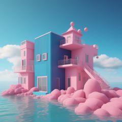 <lora:secai-surenjike:0.4>,Jade building,in the style of rendered in cinema4d,hallyu,conceptual playlists,bright sculptures,seaside scenes,animated gifs,contemporary candy-coated,Wes Anderson colors,dark blue sky,cloudless seaside,