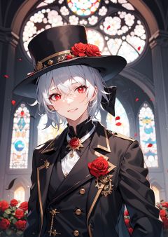 white hair,flat breasts,red eyes,high detail,Glowing eyes,short straight hair,red roses,Black gloves,trench coat,suit,brooch,Clothes that are not bare,gangsters,Wide-brimmed hat,black Suit hat,White shirt,dark blue sky,church,smile,, fcportrait