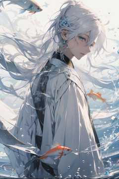 (masterpiece:1.2), best quality,PIXIV, splashing ink,long hair, fish, solo, hanfu, Chinese clothes, white background, jewelry, blue eyes, earrings, male focus, white hair, 1boy, sash, looking at viewer, simple background, floral print, floating hair, from side, hair ornament, upper body, long sleeves, goldfish, bangs, koi, obi, ponytail, water, white kimono, closed mouth <lora:splashing ink_20230807094909:1>