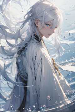 (masterpiece:1.2), best quality,PIXIV, splashing ink,solo, long hair, 1boy, male focus, blue eyes, looking at viewer, white hair, japanese clothes, water, from side, hair between eyes, bangs, bishounen, long sleeves, very long hair, floating hair, kimono, upper body, closed mouth <lora:splashing ink_20230807094909:0.9>