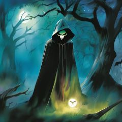 watercolor,cloak, glowing eyes, moon, skull, no humans, staff, weapon, glowing, hood, tree