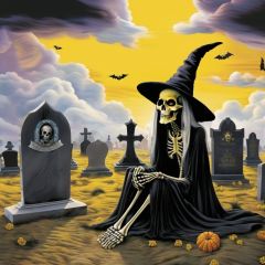 hat, skeleton, tombstone, graveyard, witch hat, cloud, sitting, yellow eyes, skull