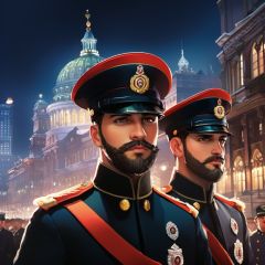 illustration,  2boys, hat, uniform, military, military uniform, gloves, city, male focus, facial hair