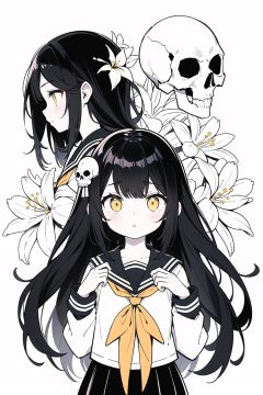 flat color,limited palette,low contrast,1girl,serafuku,long straight black hair,lycoris flower,skull mask,(yellow, white),