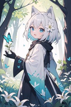 (masterpiece:1.2), high_quality ,occultism, Aestheticism Painting , (flat color), best quality, soft lighting, (depth_of_field:1.3),(solo:1.4), [close-up], (1girl), detailed beautiful blue eyes, (silvery hair) , wolf_ears, short_hair,archbishop_robe ,largr_sleeve, grey_cloak, blooming, looking_at_viewer, lily (flower) , blue butterfly, (fantastic colorful),fluorescence, (forest:1.25), tree_shade, (flowers meadows:1.4), flower, leaves, looking back, cute_fang, black gloves, long scarf,