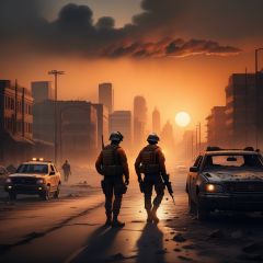 ((photo realistic)), bombed out city, flattened buildings, cracked roads, burnt vehicles, ash and soot, lone soldier silhouette, hazy orange sunset, somber ambience, dramatic lighting (depth of field)