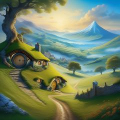 ((mystical atmosphere)),little hobbit village nestled among rolling green hills and ancient trees,round doors and windows aglow with warm light,distant lonely mountain wreathed in mist looming on horizon,meandering dirt paths between quaint homes,birds flying overhead in vivid blue sky ((hobbit concept art style)),ultra detailed,