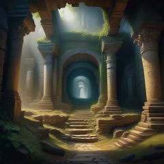 ((ancient ruins)), enormous crumbling pillars cloaked in vines, stone arches leading into dark catacombs, shaft of light illuminating subterranean chamber with intricate carvings, adventurers descending stone steps through swirling mist