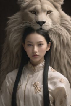 Modern Chinese girl, fashionable beauty, tall ponytail girl, Fashion clothing, lion clothing, lThe lion's head is on her shoulder,Personality Black Skirt,