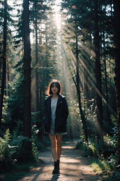 Best Quality,Masterpiece,Ultra High Resolution,(Realisticity:1.4),Original Photo,Cinematic Lighting,1Girl,<lora:Tyndall effect-Light:0.6>,full body,light through the trees,