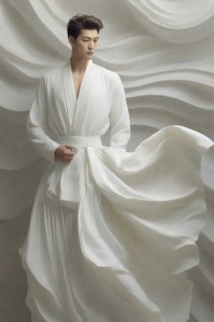 handsome men,in a white dress is standing in front of a wall of wavy fabric and waves of white fabric, fashionable beauty,floting skirt,wave skirt,