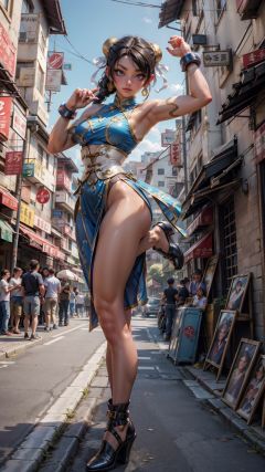 chunli, street fight 6, wearing cheongsam white, blue, gold, attractive female, full body image, front - facing looking at camera a Latina athletic body, attractive female, full body image, front - facing looking at camera,Standing split,Real,Slightmuscle, <lora:EMS-14413-EMS:1.2>, <lora:EMS-20894-EMS:0.4>, <lora:EMS-16673-EMS:0.4>, <lora:EMS-8358-EMS:0.4>