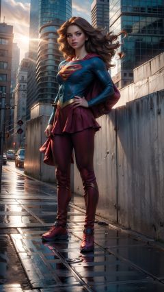 a hero supergirl ,25 age, green eyes, long brown hair, full outfit, yoga pants, sport figure, full body, standing on the roof a skyscraper, big boobs,Nipple_rings,supergirl, <lora:EMS-8358-EMS:0.6>, <lora:EMS-15581-EMS:0.8>, <lora:EMS-12498-EMS:0.8>, <lora:EMS-14413-EMS:1.2>