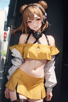 (masterpiece),(extremely detailed CG unity 4k wallpaper), (best quality), 1 girl, solo, brown eyes, cone hair bun, 1 x hair ornament, yellow skirt, headphones around neck, asymmetrical legwear, navel, thigh strap, off shoulder, light smile,