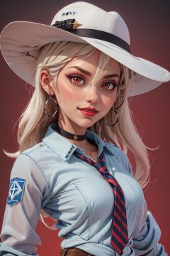 3dmm,3d,1girl, ashe \(overwatch\), breasts, choker, collared shirt, cowboy hat, earrings, eyelashes, eyeshadow, gradient background, hat, highres, jacket, jewelry, lips, lipstick, logo, looking at viewer, makeup, medium breasts, medium hair, necktie, overwatch, parted lips, pinstripe pattern, pinstripe shirt, portrait, red background, red eyes, red lips, red necktie, shirt, smile, solo, striped, stud earrings, white hair, white shirt, ((masterpiece)),Pixar