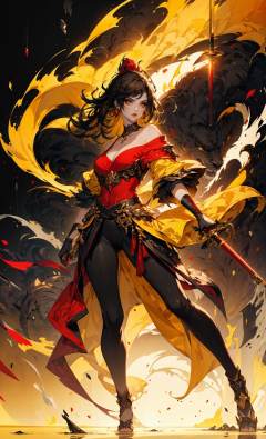 (black background:1.2),[(black background:1.5)::5], FH,1girl, weapon, sword, jewelry, earrings, black_hair, breasts, solo, gloves, holding_weapon, holding_sword, medium_breasts,full body, yellow theme,exposed collarbone, exposed shoulders,exposed abdomen,sideways glance, (cold attitude,eyeshadow,eyeliner,red lips:1.5),skinny, (Slim body:1.1),(long legs:1.3),<lora:niji_武士:0.7>