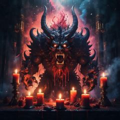 Portrait of a terrifying demon, candles, in a dark room, explosion of liquid splash blood, highly detailed, fantasy background, illustration