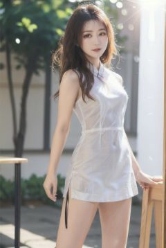UHD,4K,sharp focus,best quality,masterpiece,realistic,1girl,outdoors,cheongsam,(simple background:1.3),black eyes,White high-heeled shoes,Cold light,(upper body:1.2),(long legs:1.1),model,medium breasts,Standing,(Blurred background:1.2),( depth of field:1.2),(lens flare:1.2),