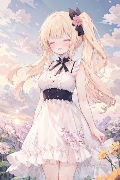 ,blunt bangs,sky,cloud hair,cloud,smile,tears,sunset,dusk,eyes closed,closed eyes,flower field,long_hair,bare_arms,floating water drop,flying petals,