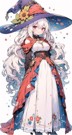 (masterpiece:1.2),(arms behind back:1.2),best quality,game cg,1girl,solo,long hair,white hair,hair ornament,dress,full body,looking at viewer,simple background,red eyes,standing,hair flower,white background,white dress,closed mouth,long sleeves,skirt,wavy hair,blush,large breasts,smile,very long hair,hand up,floral print,witch hat,elf,