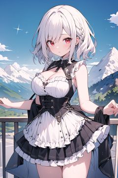 (masterpiece , best quality , high quality , highres , ultra-detailed) , short hair , silver hair , red eyes , wavy hair , breasts , frills , outdoors , mountain , close-up , alternate costume , large breasts ,