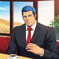 A handsome mature and strong man with black hair and blue eyes, wearing a black suit and a red tie, sitting in a café, looking at the scenery outside the window, the sun shining on his face, a close-up of the side face, hands on his chin, cold face,,homo,