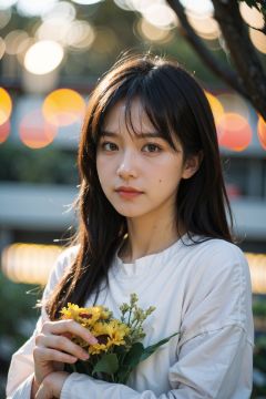 Best Quality,Masterpiece,Ultra High Resolution,(Realisticity:1.4),Original Photo,Cinematic Lighting,1Girl,Cute,sunset,sea of flowers,upper body,(bokeh:1.5),