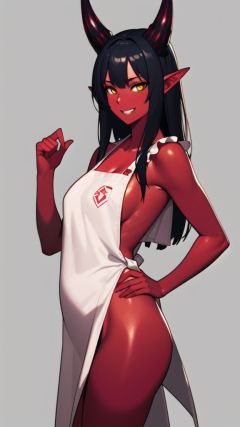 (best quality), ((masterpiece)), (highers), original, extremely detailed CG unity 8k wallpaper,(gray background:1.2),cowboy shot,meture female,1girl,standing,black hair,straight hair, (Crimson skin:1.5),yellow eyes,large breasts,small horns, grin,hand on hip,black apron,thong,bare arms, <lora:fat10kg_mix_style:1>