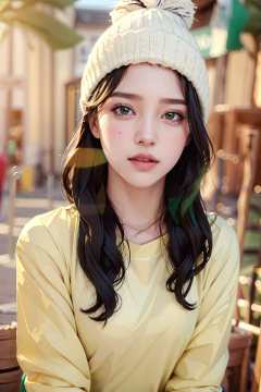 <(photorealistic:1.4), (extremely intricate:1.2)>, pale skin, 1girl, solo, long hair, black hair, clothes writing, brown eyes, looking at viewer, beanie, lips, upper body, simple background, closed mouth, white background, green shirt, studio, BREAK, <(exquisitely detailed skin), cinematic light, ultra high res, 8k uhd, film grain, perfect anatomy, best shadow, delicate, RAW>,