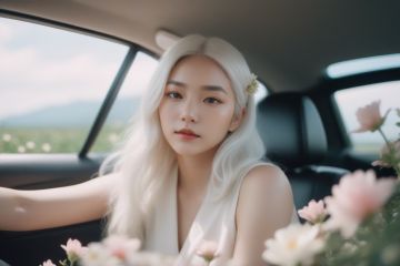 cinematic film still chinese girl, a girl with white hair sitting in car filled withflowers, art by Rinko Kawauchi, in the style ofnaturalistic poses, vacation dadcore, youthfulenergy, a coolexpression, body extensions, flowersin the sky, analog film, super detail, dreamy lofiphotography, colourful, covered in flowers andvines, Inside view, shot on fujifilm XT4 . shallow depth of field, vignette, highly detailed, high budget, bokeh, cinemascope, moody, epic, gorgeous, film grain, grainy