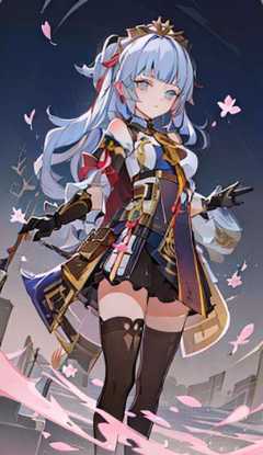 Genius_Invokation_TCG_Character_Cards, cherry_blossoms, petals, 1girl, falling_petals, rose_petals, long_hair, solo, petals_on_liquid, blue_eyes, blue_hair, blunt_bangs, standing, bangs, <lora:Genius_Invokation_TCG_Card_Style-000014:0.8>