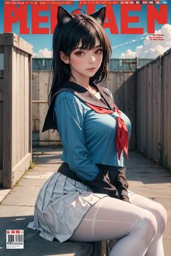 ((masterpiece, best quality)),a girl, solo, skirt, sky, sitting, pantyhose, serafuku, cloud,black gloves, outdoors, neckerchief ,day, bangs, fence, shirt, ahoge, rooftop, long hair, white pantyhose, black hair, school uniform, white sailor collar, red eyes, sailor collar, blue skirt, red neckerchief, blue serafuku, animal ears, blue sky, long sleeves, blue shirt, looking at viewer, closed mouth,cat ears, chain-link fence, pleated skirt, cloudy sky, trash can