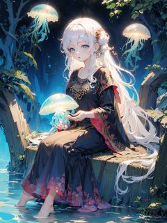 A girl with white hair, all over, sitting on a jellyfish, giant jellyfish,