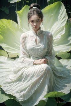 1 girl, solo, giant lotus leaf, black hair, dress, looking at the audience, white dress, hair bun, sitting, single hair bun, leaves, long sleeves, red lips, realistic <lora:add_detail(1):0.6> <lora:wlqc_20230806152502:0.65>