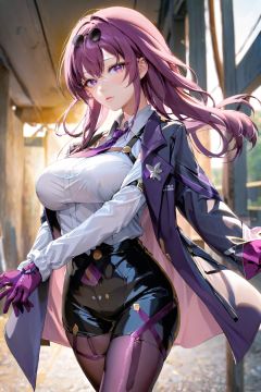 anime,masterpiece,best quality,ultra detailed,official art,beauty and aesthetics,detailed,highly detailed,kafuka,1girl,solo,gloves,purple hair,breasts,long hair,(sunglasses:1.2),looking at viewer,shirt,eyewear on head,long sleeves,purple eyes,white shirt,bangs,holding,large breasts,pantyhose,coat,necktie,collared shirt,scathach (fate),jacket on shoulders,shorts,cowboy shot,hair between eyes,standing,parted lips,jacket,purple gloves,holding eyewear,black shorts<lora:kafuka_xl:0.75>