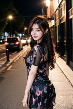 realistic, RAW photo, dslr, film grain, Fujifilm XT3, night shot, 1girl, goddess women,curly hair,  long hair, silver hair,thigh, ([:see-through:4]:1.2)  black dress, (floral print:1.2),black pantyhose,(deserted street), Backlit ,Bokeh ,Contrast Filters,(smile:0.8),from side,looking at viewer,