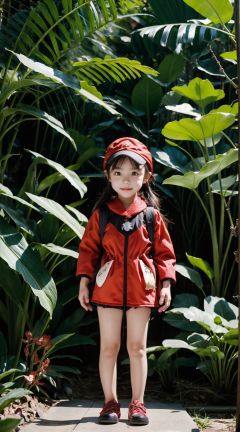 detailed illustration, kusanali,child, Blond hair,red dress, red eyes,hair ornament,knapsack,red hat, blush, full body, scenery, jungle ,32,高清,