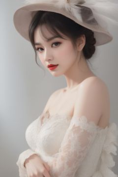 1girl,solo,.sexy pose,pensive woman,voluminous dress,intricate lace,embroidered gloves,feathered hat,curled hairdo,pale skin,minimal makeup,tender smile,dainty neckline,nostalgic atmosphere,still life,