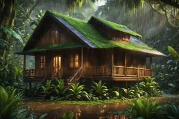 flying raindrops,a small wooden house built in the rainforest,a photo of a  highly detailed digital painting,dim volumetric lighting,8 k,octane beautifully detailed render,extremely hyper detailed,intricate,epic composition,cinematic lighting,masterpiece,trending on artstation,very very detailed,stunning,hdr,smooth,sharp focus,high resolution,award,winning photo,dslr,5 0 mm,