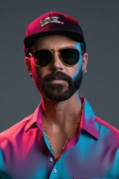 coocolor, 1boy, male focus, solo, sunglasses, facial hair, shirt, hat, realistic, earrings, jewelry, gradient, collared shirt, black hair, simple background, portrait