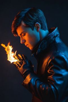 (coocolor:1.3), coocolor, male focus, 1boy, solo, fire, from side, upper body, dark, short hair, gloves, covering own eyes, profile