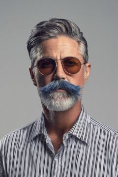 coocolor, 1boy, male focus, solo, facial hair, beard, realistic, shirt, sunglasses, mustache, portrait, closed mouth, glasses, simple background, striped shirt