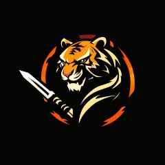 Game silhouette (j/ying), black background, gradient color, a full-body Angle tiger holding a weapon roaring, domineering posture<lora:sdxl_jianyingV5:0.8>