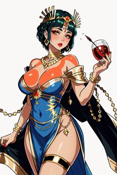 Cleopatra VII Philopator, Queen of Egypt in 20 BC, short hair that falls to the shoulders, with many braids, a crown, heavy makeup, eye shadow, eyeliner, blush and lipstick, lavish earrings and necklace, a lavish long gown, a cloak,shot form side,face to viewer,prompt by ethan for flyingsnow model