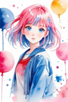 (watercolor \(medium\):1.35), color splashing, colorful,flat colo,full body,white background,blue eyes,hair ornament,simple background, cube hair ornament, pink hair, 1girl, bangs, high quality