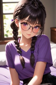 best quality, ultra-detailed, super detailed skin, cinematic lighting, sumifuji, medium hair, braid, blunt bangs, glasses, purple shirt, short sleeves, black skirt, bed, sitting, indoors, looking at viewer,