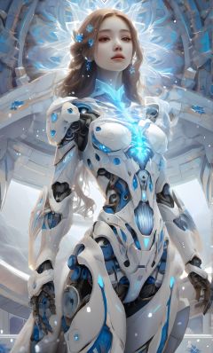 (masterpiece, top quality, best quality, official art, beautiful and aesthetic:1.2),extreme detailed,(fractal art:1.3),colorful,highest detailed..,(1girl),White,Blue,Chest,Abdomen,Snowflakes falling,(whole body:1.5),a face,relief,<lora:luzcmechasdxl-000006:0.9>,mecha,